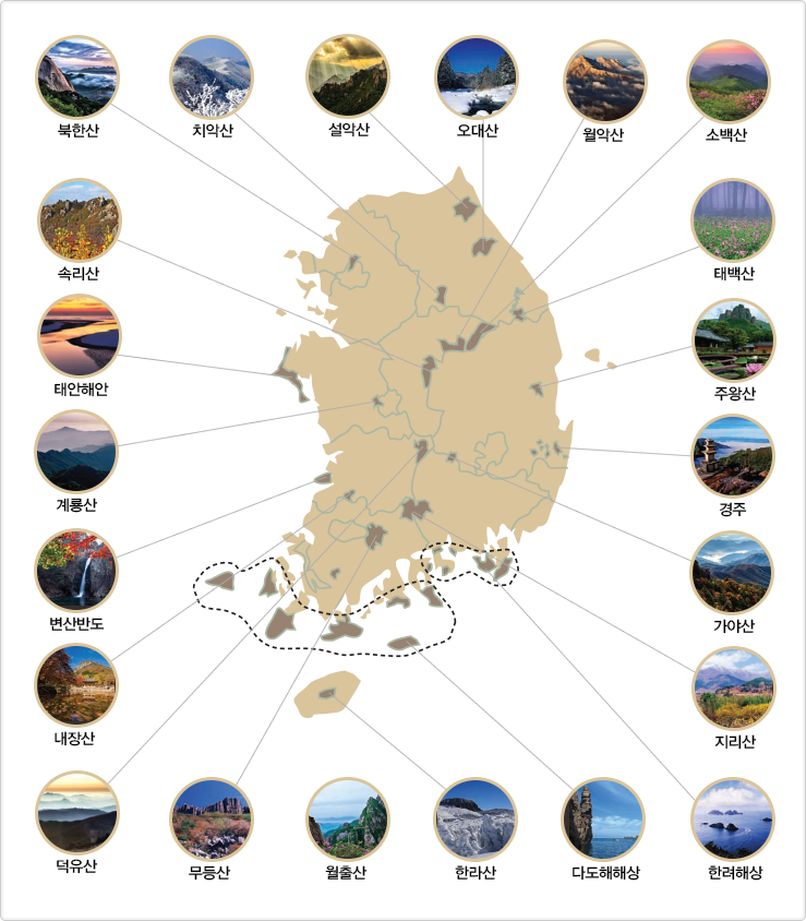 - 설악산(강원), 지리산(전남·전북·경남), 북한산(서울·경기), 속리산(충북·경북), 치악산(강원), 계룡산(충남), 월악산(충북·경북), 오대산(강원), 가야산(경북·경남), 내장산(전북), 덕유산(전북·경남), 소백산(충북·경북), 월출산(전남), 무등산(광주), 한라산(제주)